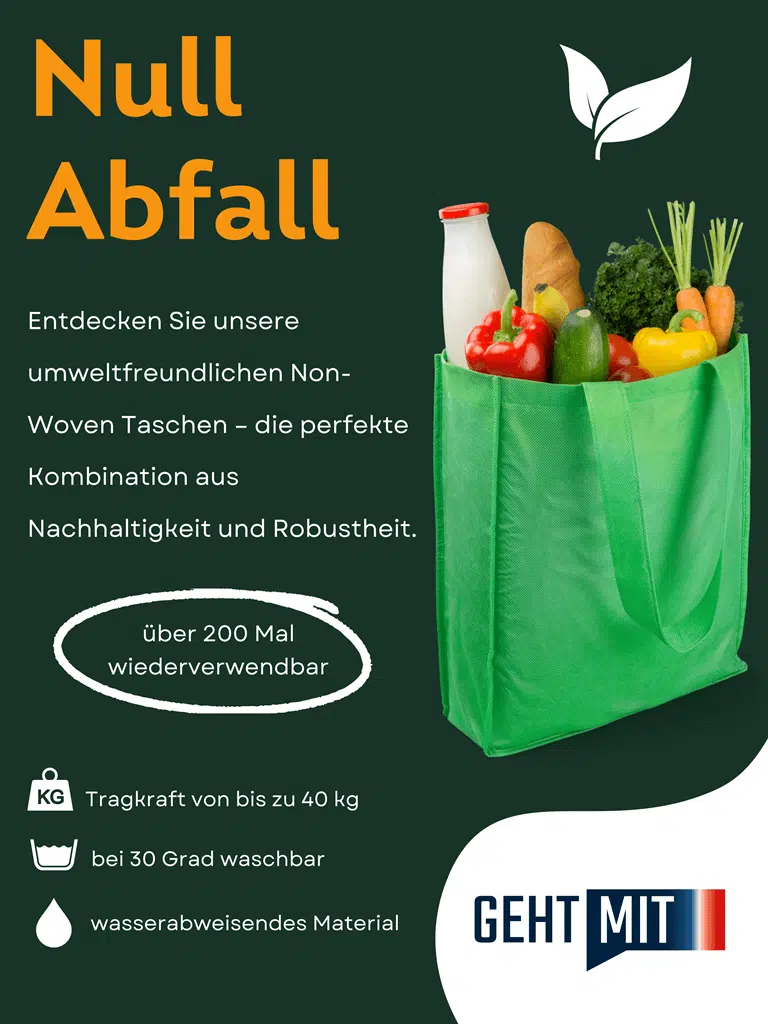 Neben ihrer visuellen Anziehungskraft sind unsere Non-Woven Tragetaschen auch eine umweltfreundliche Wahl. Diese Taschen sind über 200 Mal wiederverwendbar und bei 30 Grad waschbar. Ihr nachhaltiges Material und ihre Wiederverwendbarkeit unterstreichen nicht nur Ihr Umweltbewusstsein, sondern zeigen auch, dass Stil und Verantwortung Hand in Hand gehen können.